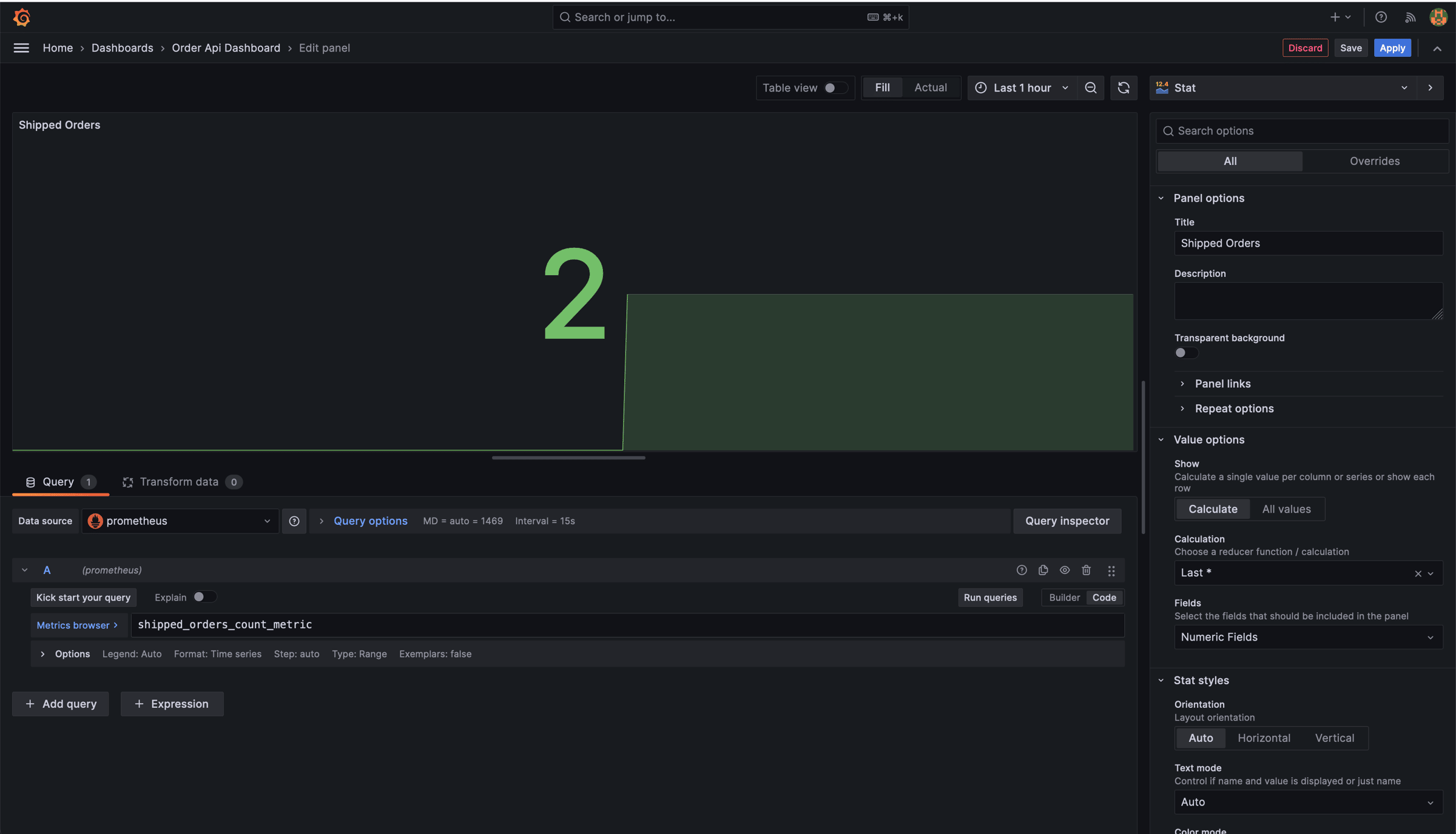 shipped_orders_count_metric, use a single-value panel to display the current count.