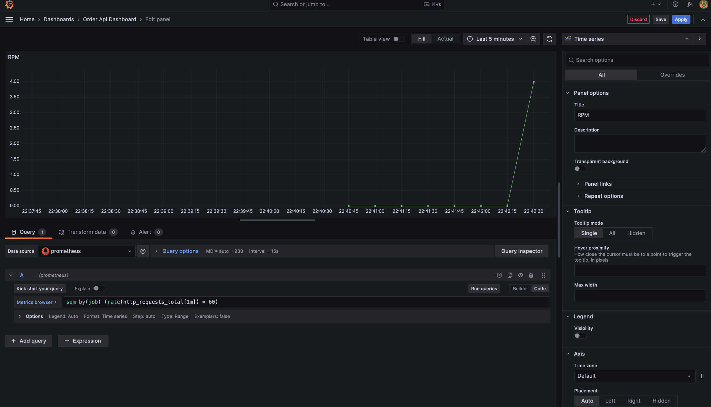 sum(rate(http_requests_total[1m])) by (job) * 60Use the "Time Series" visualization type.